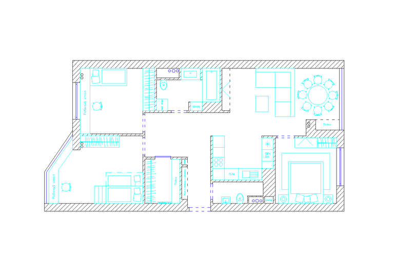Меня смутила обеденная группа, так далеко расположенная от кухонной зоны. Не сделала бы так хотя бы потому, что несколько раз в день носиться с посудой не вариант. Не считая еще детских перекусов:)