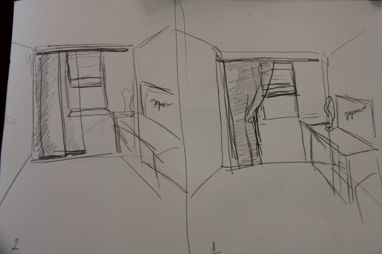 Декор окон. Текстиль. Жалюзи.Добрый день! Подскажите советом по оформлению окна в комнате приблизительно 3 на 4 метра, которая будет использоваться как кабинет гостевая спальня и гардеробная. Она немного асимметрична: слева до окна 112см, само окно 117 см, справа до окна 84 см. В левой же части некрасивый стояк батареи, который нужно закрыть и в этой же стороне хочу уравновесить шторами верхними переполненную мебелью правую часть. По центру окна римская штора, батарея под окном закрыта решеткой. У меня 2 варианта. В одном асимметричные шторы-зкраны, под цвет рисунка обоев - коричнево - оливковый более - менее насыщенный, льняные. Справа они же маленьким коротким экраном с потолка свисают короче римских штор. Во втором варианте это те же льняные шторы но оформлены свободной складкой ( может, на магнитах) слева от окна над римской шторой. Римская штора в тон обоев цвета топленого молока из хлопка или бязи. Вот какие у меня рисунки, простите за спешку, не дает ребенок хорошо нарисовать, а сфотографировать комнату нет возможности - мы вдалеке. И еще фотография обоев, может подскажете где лучше купить лен на шторы под цвет ( Калининград и Санкт -Петербург)
