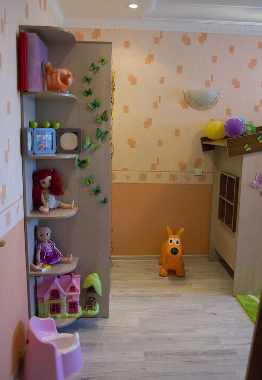 Очень нравится! Наверно, дочка обожает свою комнату! Отличная идея с занавесом между стеллажами. А дочка там как играет? Представления устраивает?