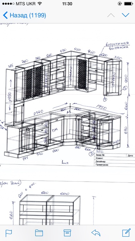 А у меня не уточнял ничего)) Поменяли низ. Будет тумба вровень с пеналом и выдвижные ящики 700. Тут симметрия. А дальше на 50 см гуляет... Предложил верхнюю угловую трапецию сделать 600, а не 550. Справа шкафчик будет не 450, а 400. Слева сушка не 600, а 500. Теперь думаю: не мало ли сушка 500? У меня трое мужиков в доме.