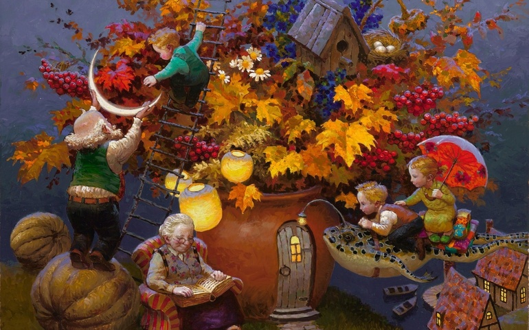 мне понравилась с осенью, но как-то тематическая она что ли))) и с кексами)))) и где полеты на чайнике, в принципе все картинки хороши)) русалок тоже посмотрела на сайте, очень необычно))