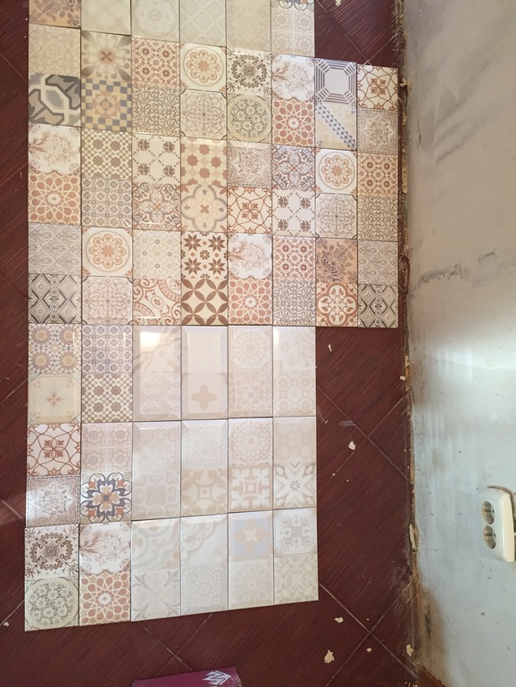 Плитка на стену уже куплена... От нее и пляшем. Столешницу будем брать светлую, песочную. Над полом еще думаем. Как и над стенами))