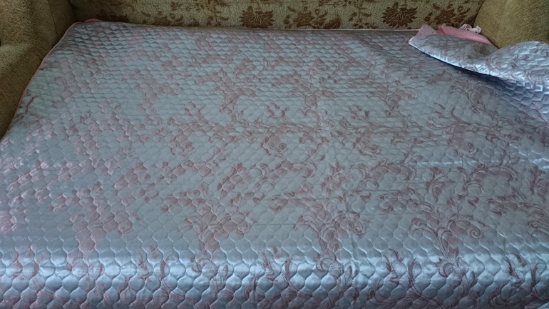 Я покупала аналогичный отрез ткани и по краю бейкой сама обшивала (а можно в ателье обратиться). Ткань идет сразу двухсторонняя, с тонким наполнителем и термостежкой.