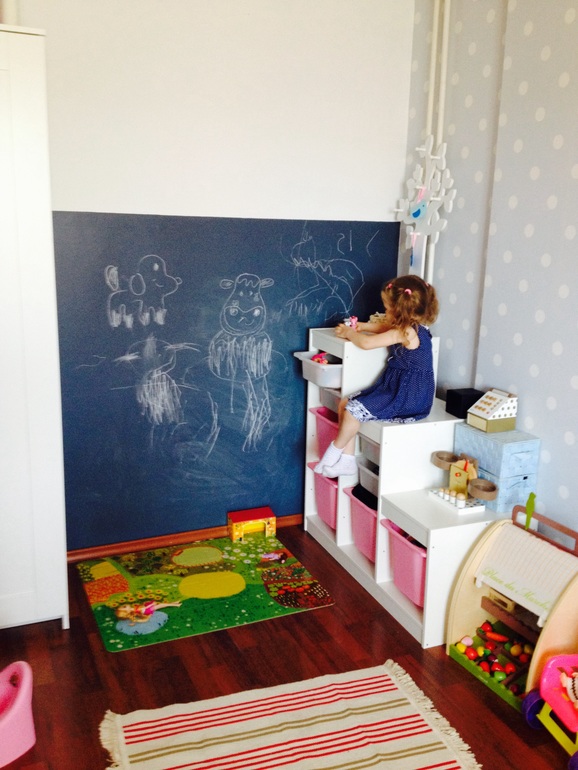 Стена супер! Покрасила такой же краской мебельный щит на даче и повесила на забор! В детской обязательно сделаю :)))
