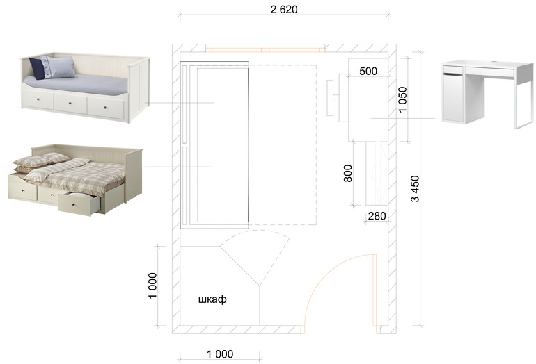 Из необходимых вещей: письменный стол, два спальных места (кровать и возможно диван),