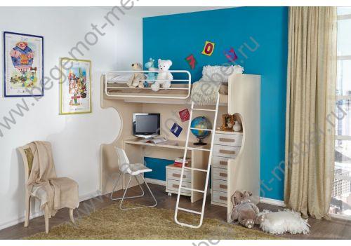 По стене мебель: около окна шкаф, далее кровать чердак+письменный стол.