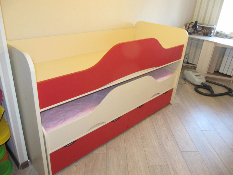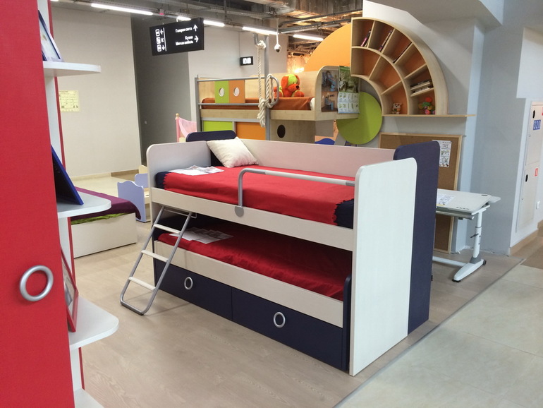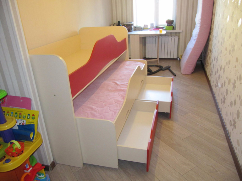 У нас просто такая детская, что ребенок в ней только спит. комната два на три, чуть больше. там нет игрушек, только спортивный комплекс, две кровати и комод. кровать конечно думаю пониже сделать, эти ящики снизу мне наверно ни к чему.. а еще муж боится что малой может упасть сверху, с двухъярусной