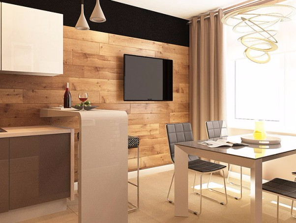 Интерьерное решение кухниДевочки, как правильно побрать ламинат для декорирования стены? Лучше чтобы был одинаковый с полом или другой декор выбирать? Стена должна с чем-то перекликаться тогда. Где повторить тогда это дерево? Это будет кухня.