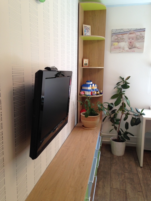 Отличная нейтральная детская получилась, по мере роста ребенка можно будет трансформировать ее разными аксессуарами под его предпочтения. На мой вкус не хватает вкраплений красного, хотя бы пару красных подушек-думочек на диван. И слева возле стола я бы прибила пару полок рибба икеевских белых для выставки работ ребенка.