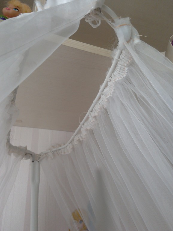 Я своей сделала так. На дешёвом держателе за 300р. Он крепится к кровати на пластмассовые винтовые держатели, ничего сверлить не надо и снять можно в любой момент. Тоже очень хотелось уголок принцессы.