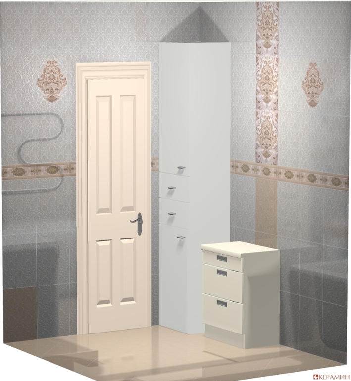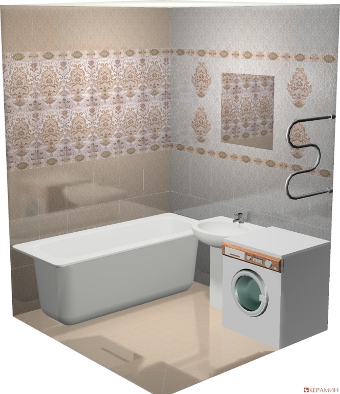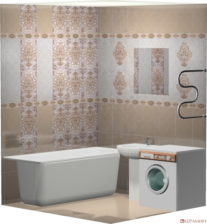 у этой плитки сам фон уже красивый - нежный. Я бы не использовала столько декора. Бордюры слишком высоко , тут или вертикальные полосы оставлять но без деления на темный низ и светлую середину. Насколько я помню в керамине размер плитки 27,5*40 - у вас что-то не так с размерами... два ряда плитки=80 см, умывальник и стиралка обычно на высоте 85 см, они должны быть выше второго ряда плитки, а у вас ниже. Зеркало задрано слишком высоко. Неправильные пропорции искажают восприятие.