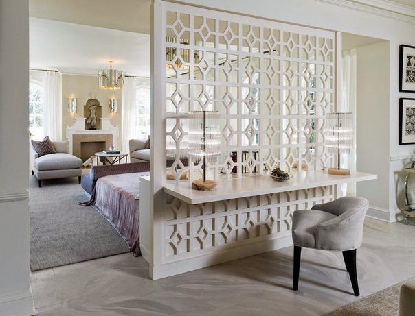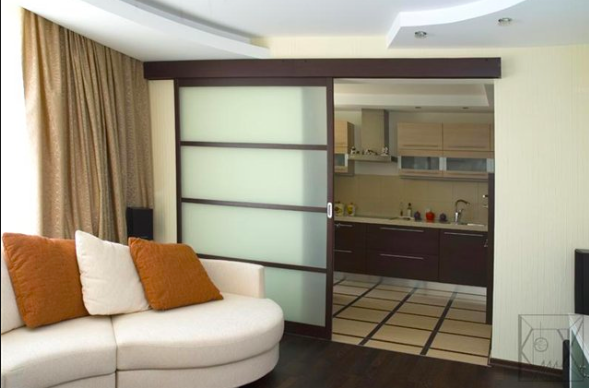 Изначально у меня была идея оставить маленькую спальню под детскую, объединить кухню с большой комнатой и сделать на получившейся площади три зоны (спальню, гостиную и кухню). Спальню отделить от гостиной с кухней стеной на полкомнаты из гипсокартона. Вроде этого