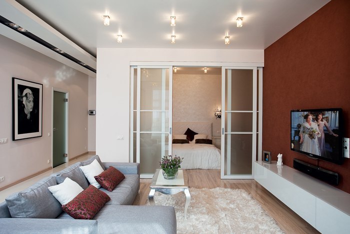 Но мои родители, которые по образованию строители, говорят, что это будет ужасно смотреться и неудобно с функциональной точки зрения.Мол, спать вы будете по сути в кухне, соответствующие запахи от готовки и если один не спит и что-то делает на кухне (меня ночью частенько разбирает что-нибудь приготовить) или в гостиной, то он будет мешать тому, кто будет спать, т.к. полноценных стен, а значит и звукоизоляции, не будет. Полностью отделить небольшую спальню от гостиной с кухней (передвинув стену) не получится, точнее не хочу, т..к у нас в большой комнате угловое панорамное окно. Смысла от него в спальне не будет.