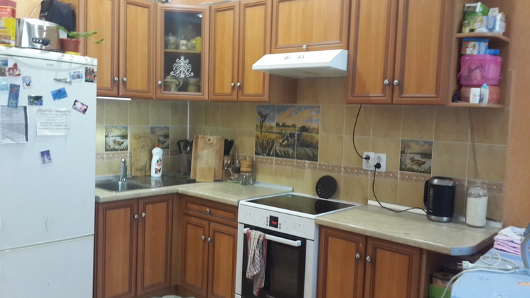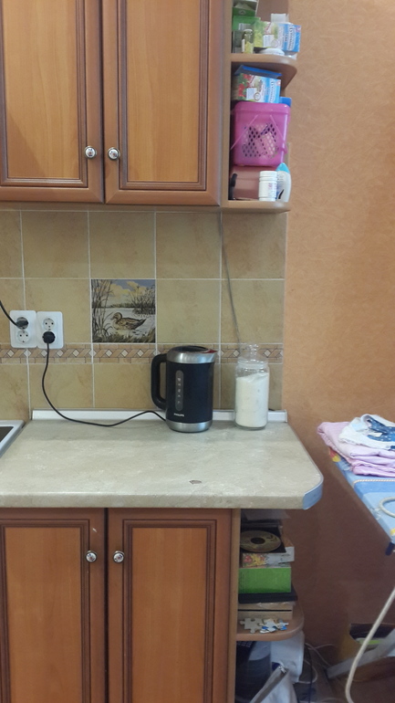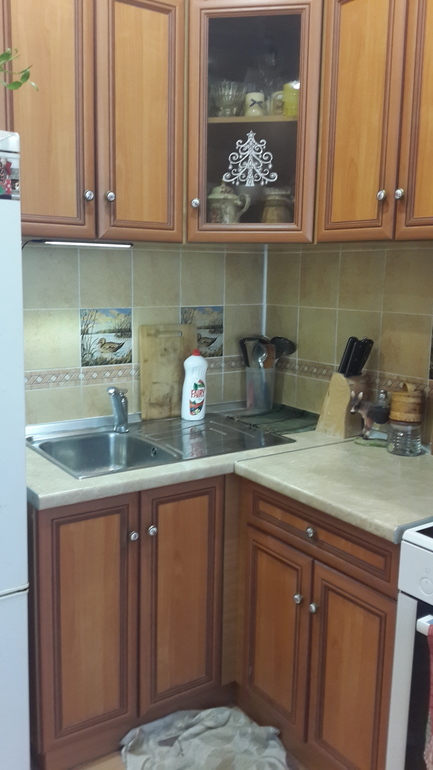 Надо сказать кухня большая - 18 кв м. Перепланировка- была перенесена в угол зала. На бывшей кухне - спальня.