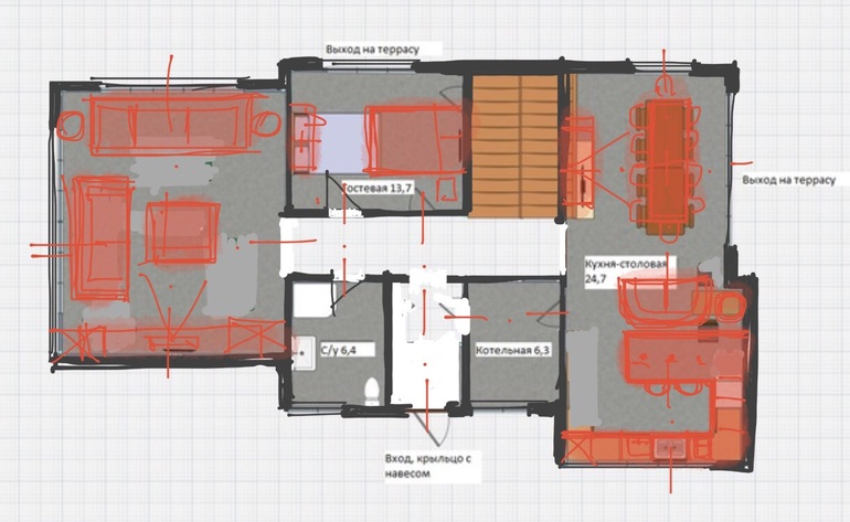 По кухне-столовой: думаю, будет не стойка, а узкий столик обычной высоты (он есть на плане). Он должен легко убираться при необходимости разложить основной стол на все 3 с небольшим метра. Чтобы не тереться об него попой. Диван по этой же причине исключен... Да и не нужен он)) Телевизор на плане тоже сдвинут к краю лестницы не просто так: ближе к уличной стене будет неглубокий встроенный сервант для стекла. В гостиной шкафов или мебельных стенок так же не будет, но это вообще мелочи)) В санузлах сложно играть расположением мебели. В двух из трех санузлов угловые окна в пол. В третьем (детском) просто большое окно, там варианты есть. На кухне газовая плита должна быть по стенке котельной, ибо именно там, собственно, подвод газа. И опять же, там огромное угловое окно, которое никак не позволяет разместить по лицевой стене дома холодильник
