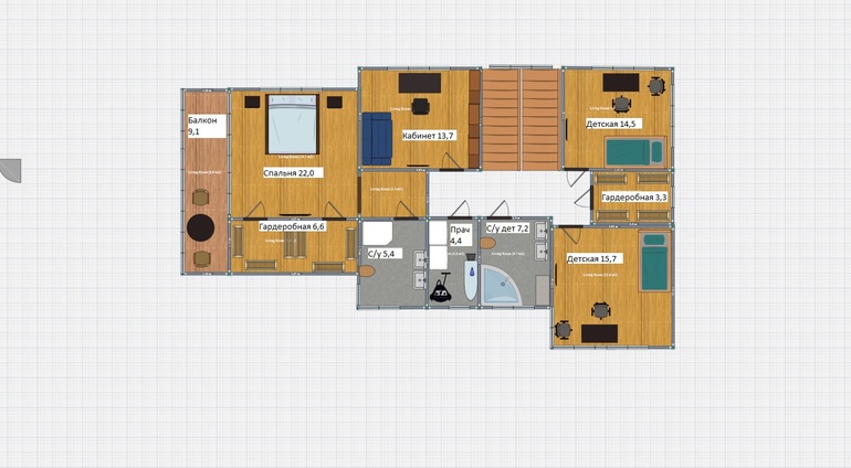 Мебель "расставлена" из того, что было бесплатного в планнер 5д, поэтому не очень соответствует реальности, не воспринимайте очень буквально))). Под игрушки поставим детям что-нибудь, достаточно ящика. Для книг есть большой стеллаж в кабинете. Дом не для пмж, не замена городской квартире в ближайшей перспективе.