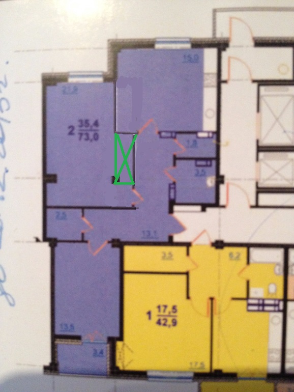 Здорово!У Вас хорошая перепланировка.Но нам с.у. нельзя совмещенный(муж не переживет).Мне понравилась идея ниже selena1002. Сейчас пока думаем,то ли двушку оставлять -спальня детям и игровая и наша спальня + кухня-гостиная,или трешку(нарисована ниже).