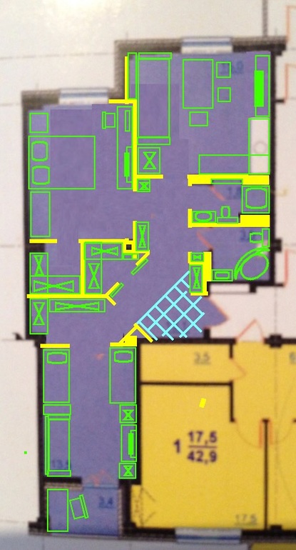 Около входной двери голубыми клеточками я изобразила покрытие пола плиткой и грязную зону.