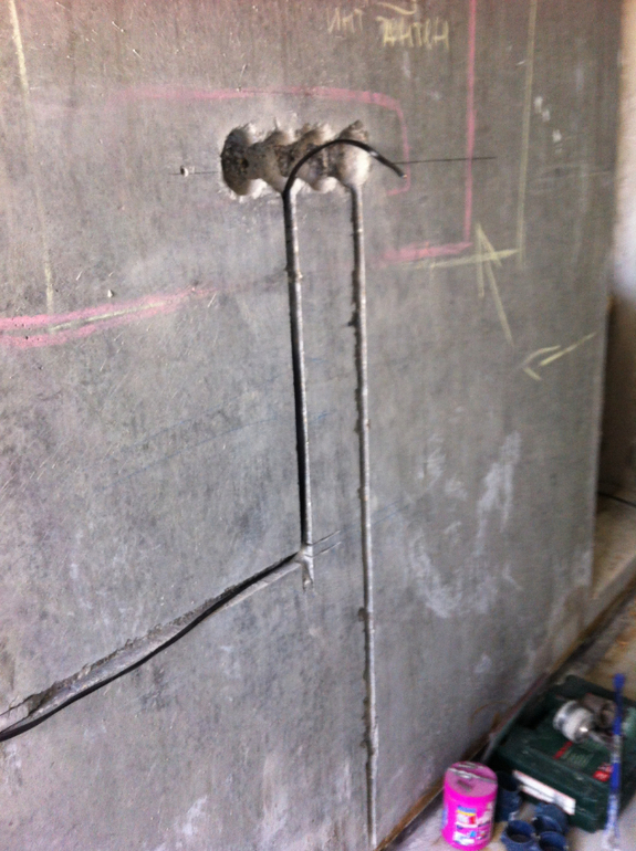 У нас тоже в полу электрика, т.к. ни одного потолка искусственного мы не планировали изначально, но рабочие их железками какими то к полу крепили прежде чем заливать и аккуратно все провода тянулись к щитку