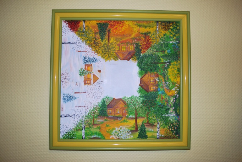 Спасибо, что оценили!)))) Ее еще и переворачивать можно каждые три месяца, под времена года, я там специально такие крепления заказывала..Картина маслом 50х50 "Круглый год в квадрате", была продана за 5000р, цена получилась из цены работы, холста на картоне, красок и рамки, она тройная, так как подбирали под интерьер. Можно повторить) а можно и новое придумать, но в том же стиле)