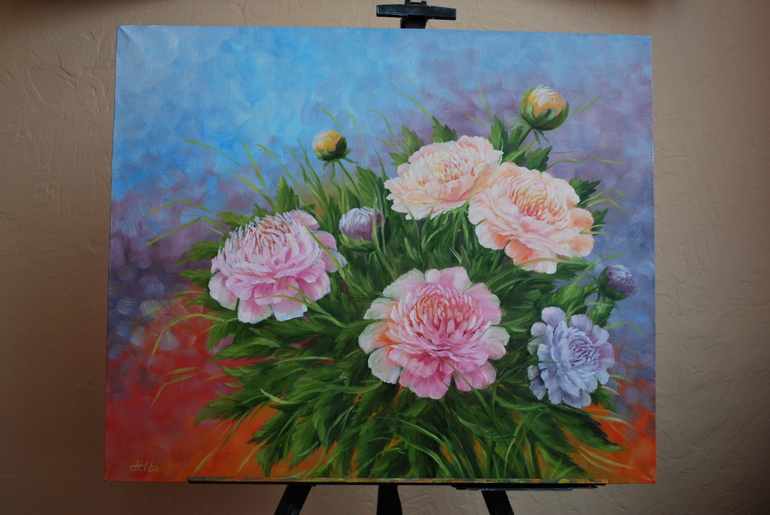 На серебряную свадьбу рисовала подарки)) "Тихо падал снег" и "Цветы счастья и любви" ( пионы очень "фэншуйские" цветы - приносят мир, любовь и благополучие в ваш дом, говорят, что изображение пионов должно быть в каждом доме)))))))