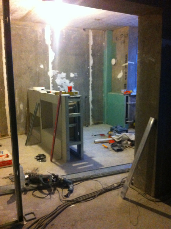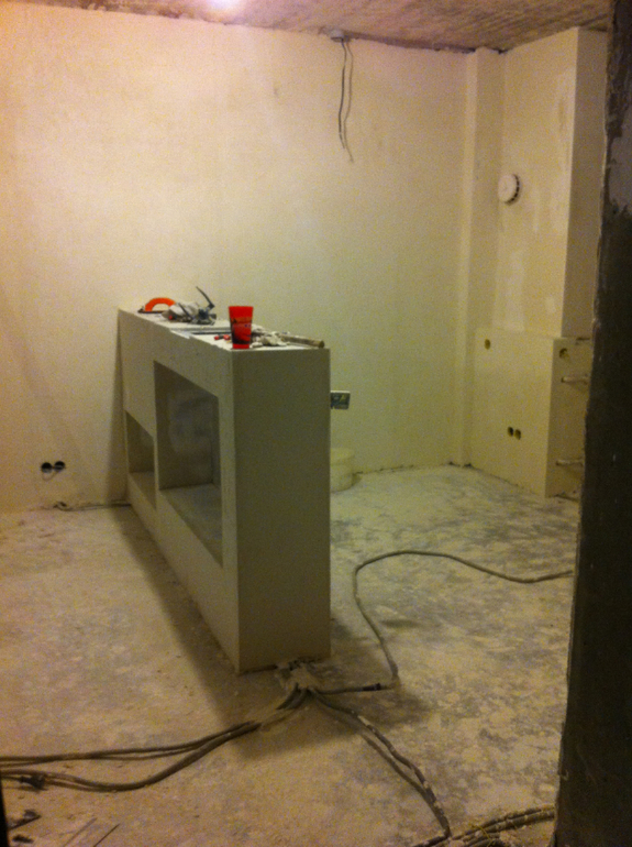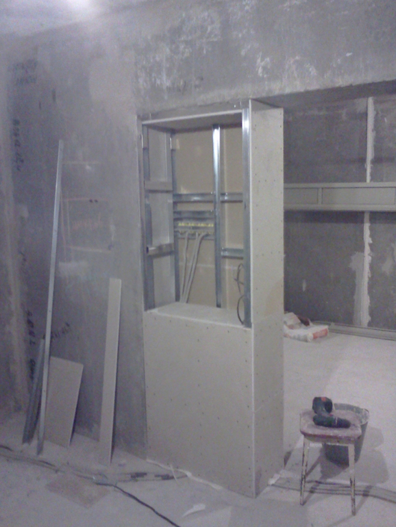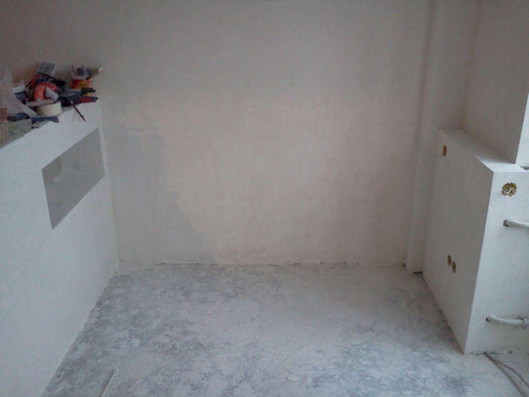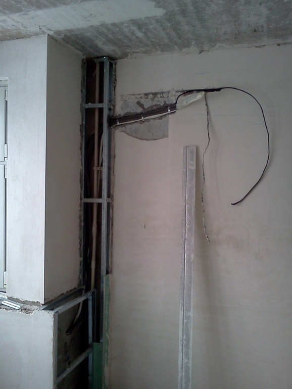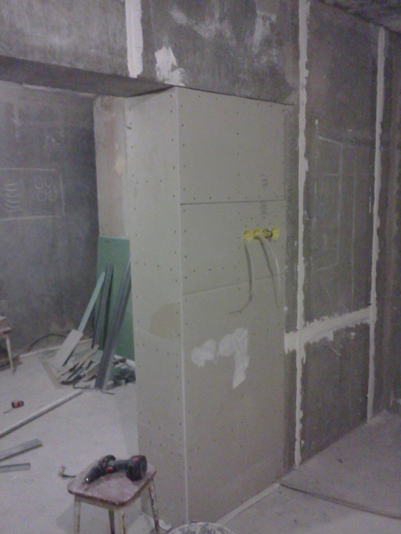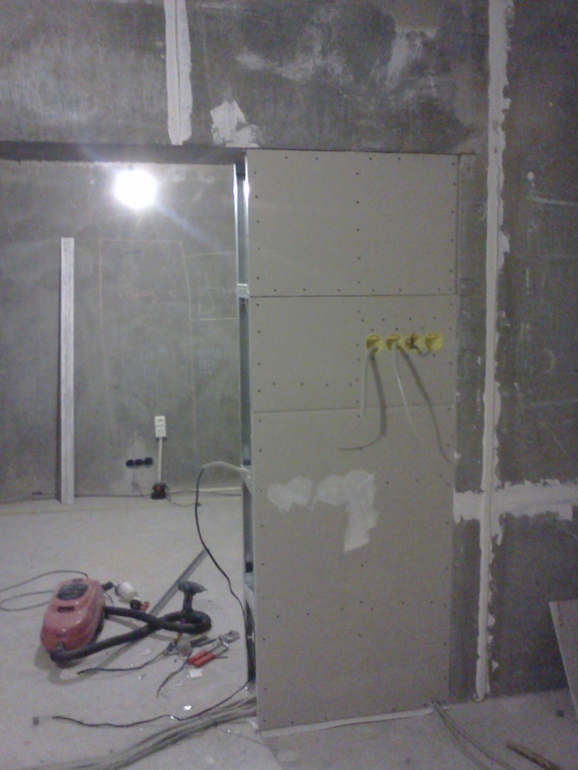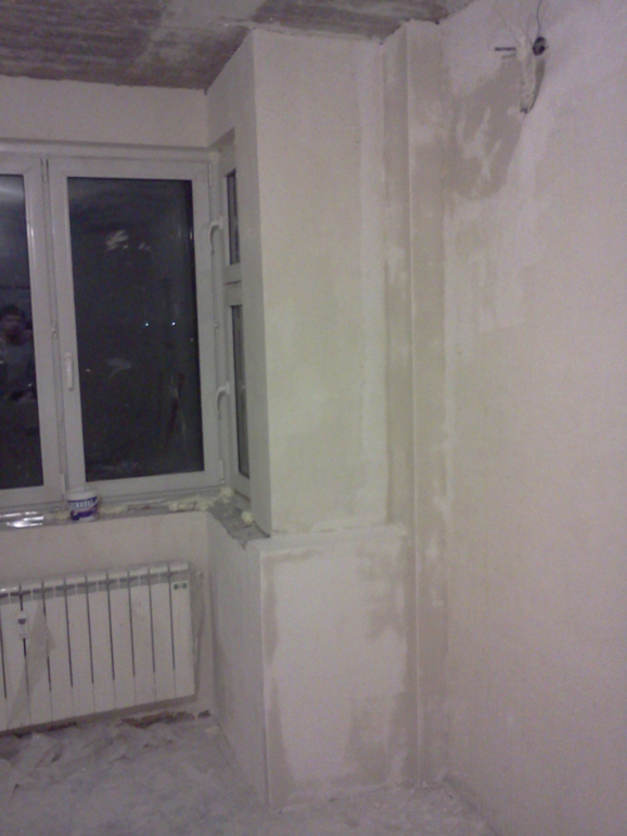 Ну и после всех гипсокартонных мероприятий наконец то заштукатурили комнату. В некоторых местах слой штукатурки был до 1,5 см(((( Тут мы хитрили и использовали листы ГК, для экономии штукатурки. Белые полоски это маяки.