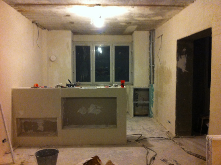 После того как отштукатурили детскую, принялись за гостиную. Комната у нас 19 кв метров, с квадратным эркером и широким проходом на кухню.