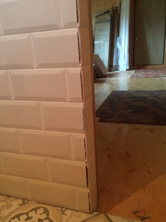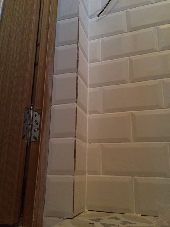 Все вроде бы ничего,внутренние углы выкладывали при моем присутствии и они вышли идеальными,а вот на внешних я уже уехала и вот,что вышло...