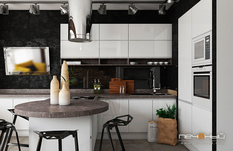Конечно, всё небольшое, но кухня, к примеру, получилось вместительной. Экономит место и островок: если бы вместо него, скажем, мы поставили обычный стол, в кухне было бы негде развернуться. Столешница выполнена из искусственного камня, на фартуке - прозрачное стекло, сама стена отделана декоративной штукатуркой, которая хорошо и контрастно смотрится с глянцевыми белыми фасадами.