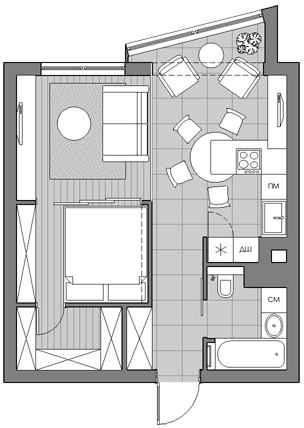 Вот такой у нас получился нестандартный вариант планировки однокомнатной квартиры, наглядно иллюстрирующий, что мы делаем работу для каждого человека индивидуально, по его личному ТЗ. Что, наверное, самое важное в работе дизайнера: сделать не только по-журнальному красиво, но, главное, удобно для жизни и функционально.