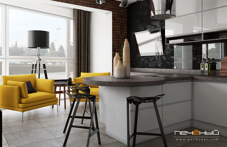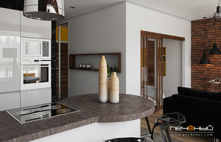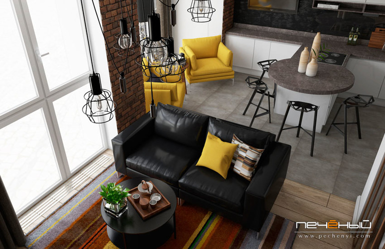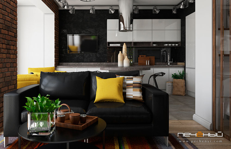 Смотришь на картинку и понимаешь: мужской интерьер. Забавно, но квартира принадлежит семейной паре, правда, участие в обсуждениях супруга не принимала. Заказчику нравился лофт, но главное, чего ему хотелось - это (внезапно!) выкроить место под гардеробную. Вообще, шкафов по просьбе молодого человека получилось много - ниже на плане вы убедитесь в этом сами. :)