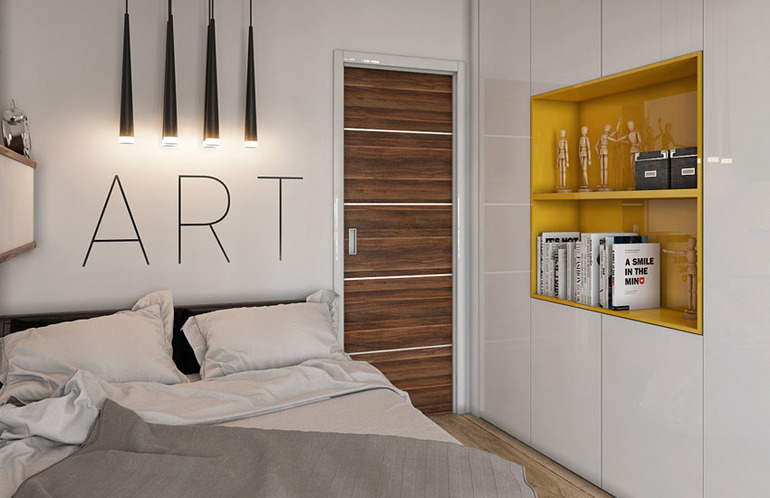 По сути, размер спальни слегка превышает размеры кровати - зато, как видите, здесь есть шкаф (вокруг жёлтой ниши). Возможно, кому-то покажется странным такое количество шкафов, но заказчикам нравится минимум декора, и абсолютно всё, что можно убрать с поверхностей, они готовы спрятать подальше от глаз. К слову, благодаря белым стенам, одна из которых ещё и глянцевая, спальня не давит на психику размерами и не выглядит табакеркой. :)