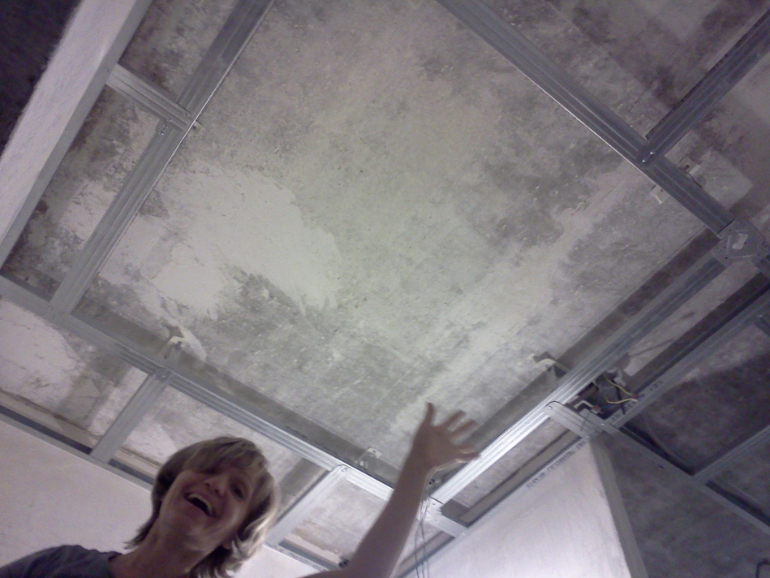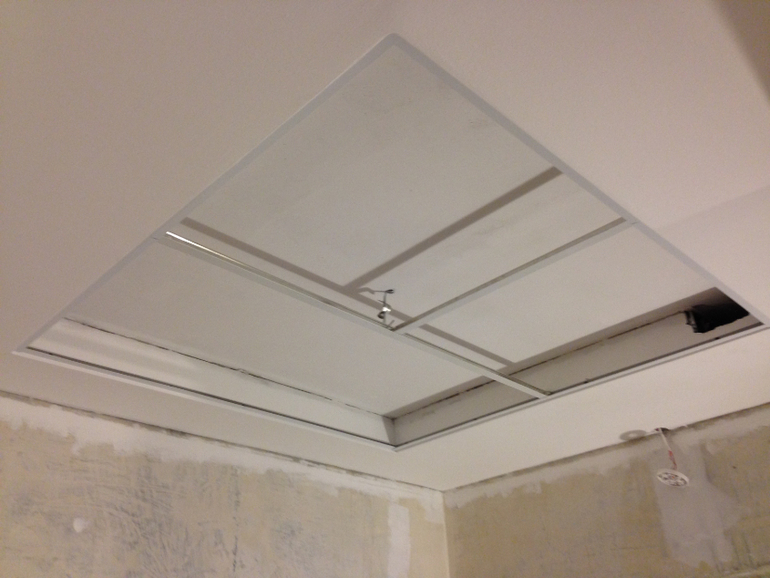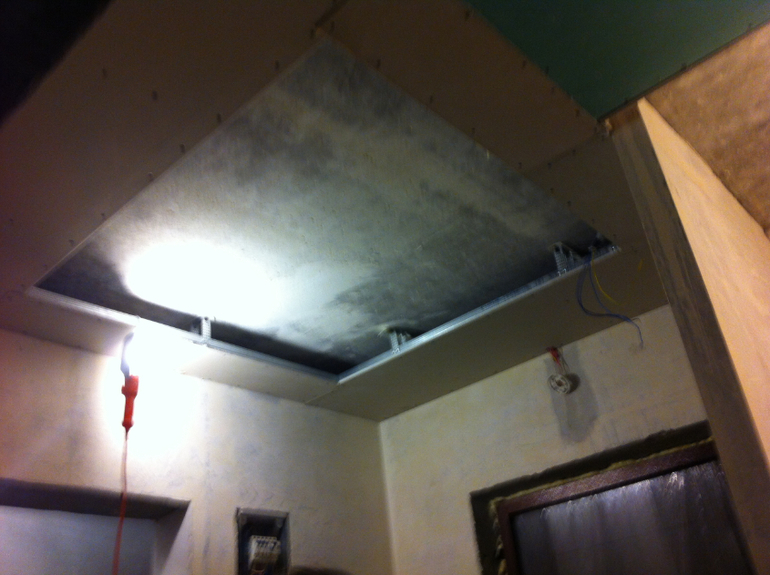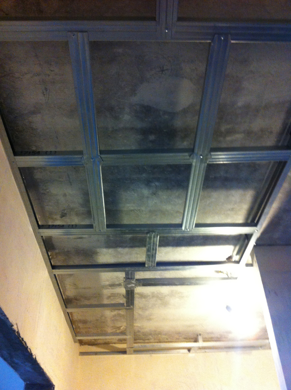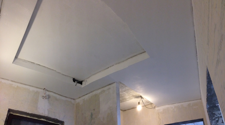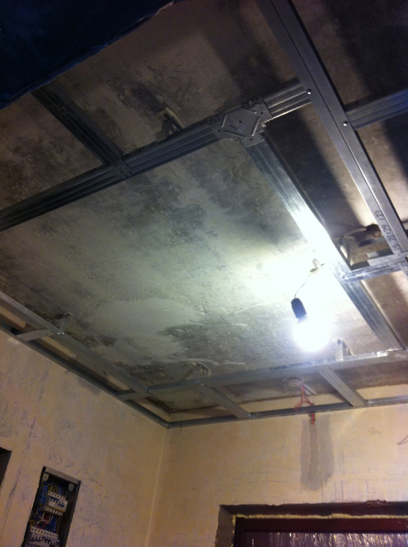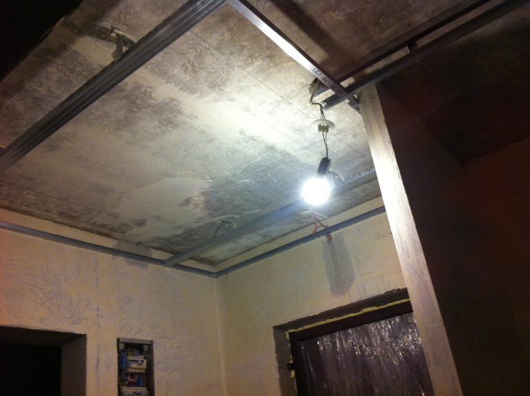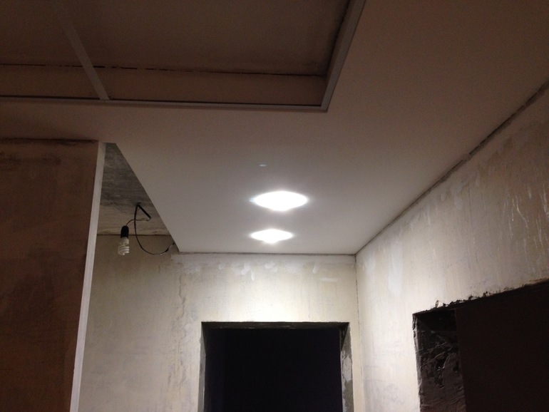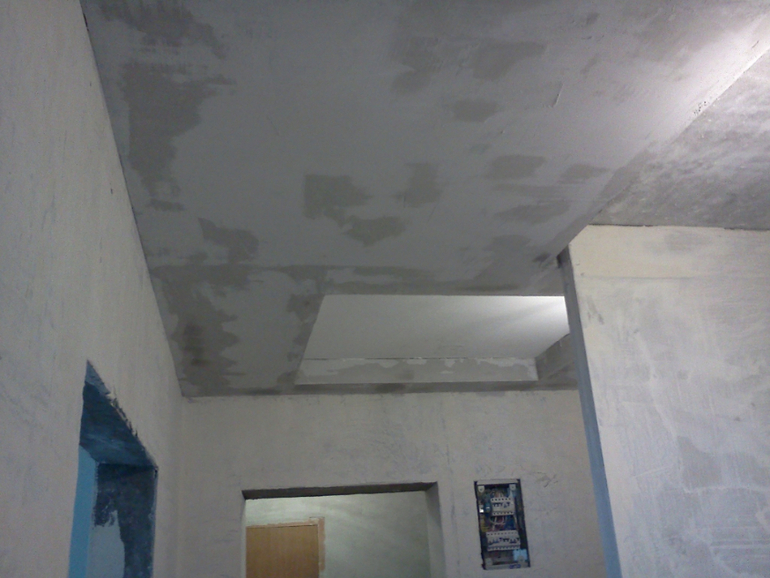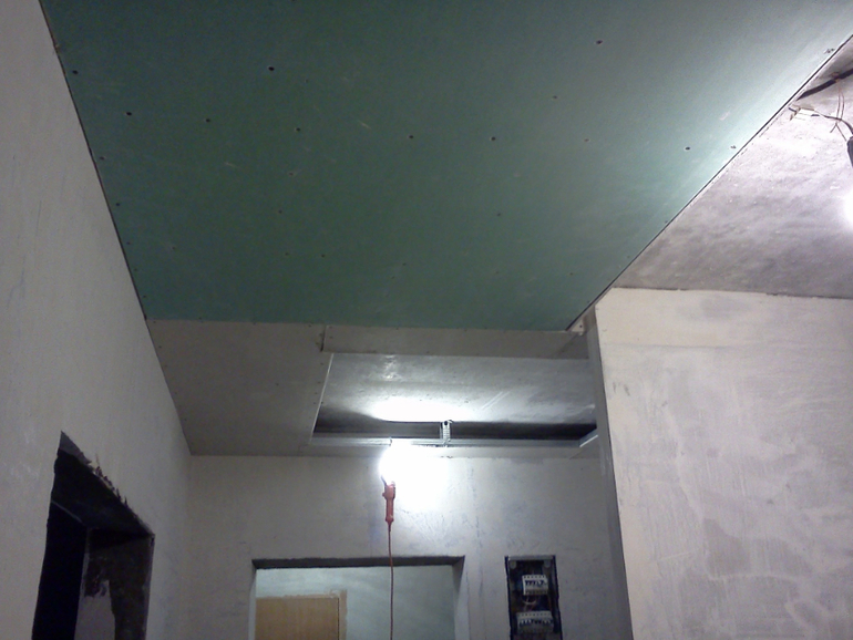 Таким образом у нас получился коридор буквой Г. По поводу потолка, хотели натяжной, но взвесив все за и против, решили сами сделать из ГК. Что могу сказать, опыт уже был. Но самое сложное это прилепить к потолку большой лист ГК. Особенно когда даже на стремянке мне было тяжело его держать, т.к. надо было на три точки опору делать, если руками я могла держать, а вот головой не получалось)) ибо "хоббит")) как ласково называет меня муж))) Но справились)) И не сломали ни одного листа ГК. В зоне прихожей решили сделать подвесной потолок, стеклянный. Квадрат получился не большой на 4 стекла. (система подвесных потолков Армстронг), а внутри сделать светодиодную ленту. К сожалению стекла пока не купили, по этому пока так). Если есть вопросы как делать, все расскажу) Не сложно). Потолки красили той же краской что и на кухне. Сейчас уже, могу сказать что надо было на потолки клеить стеклопаутинку. И поверхность получилась бы прочнее, и краска легла бы лучше.