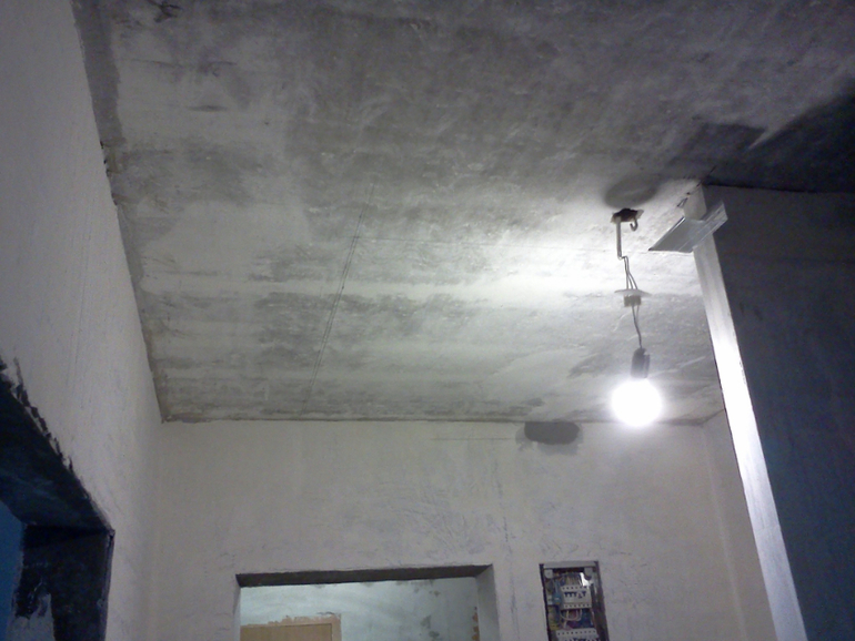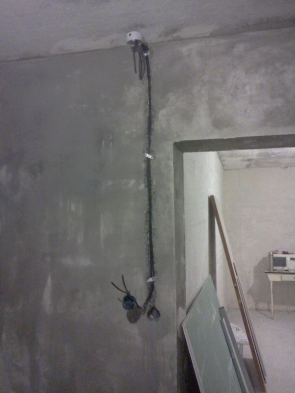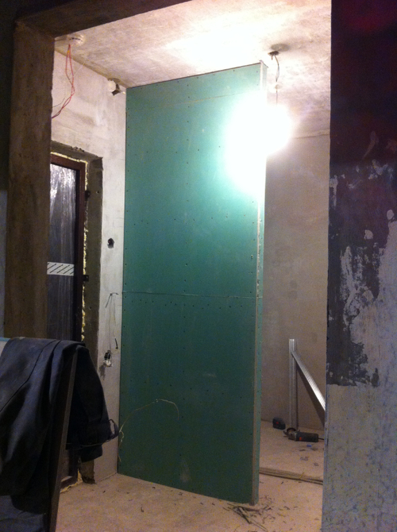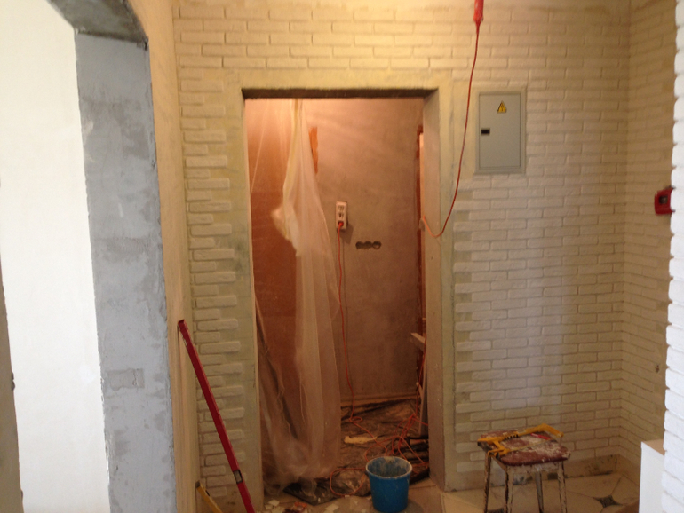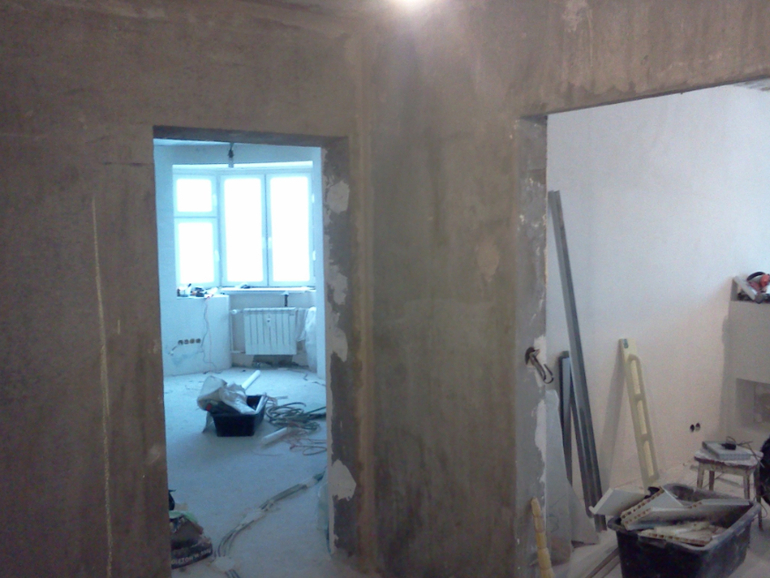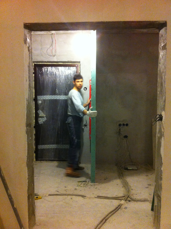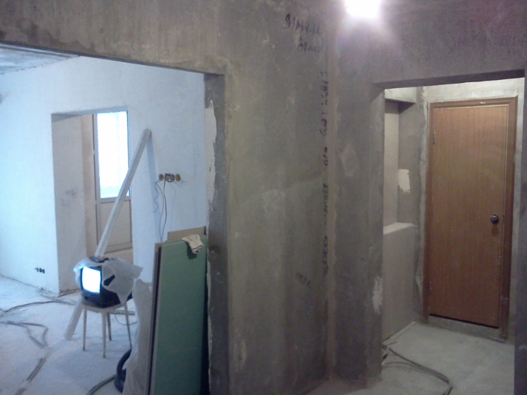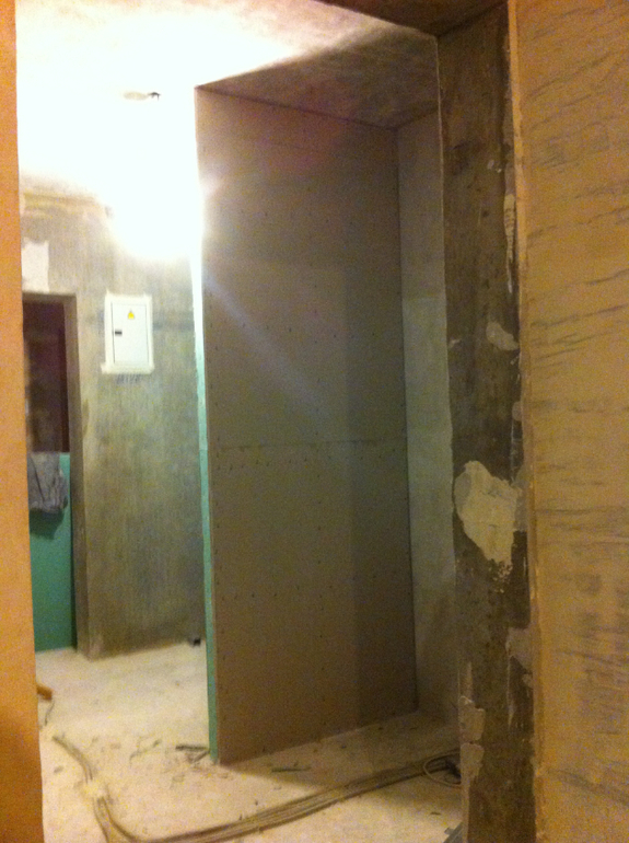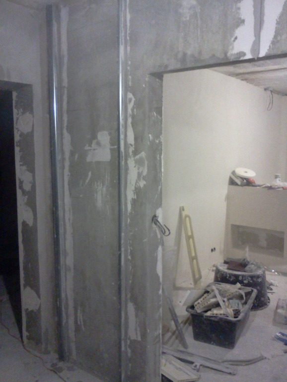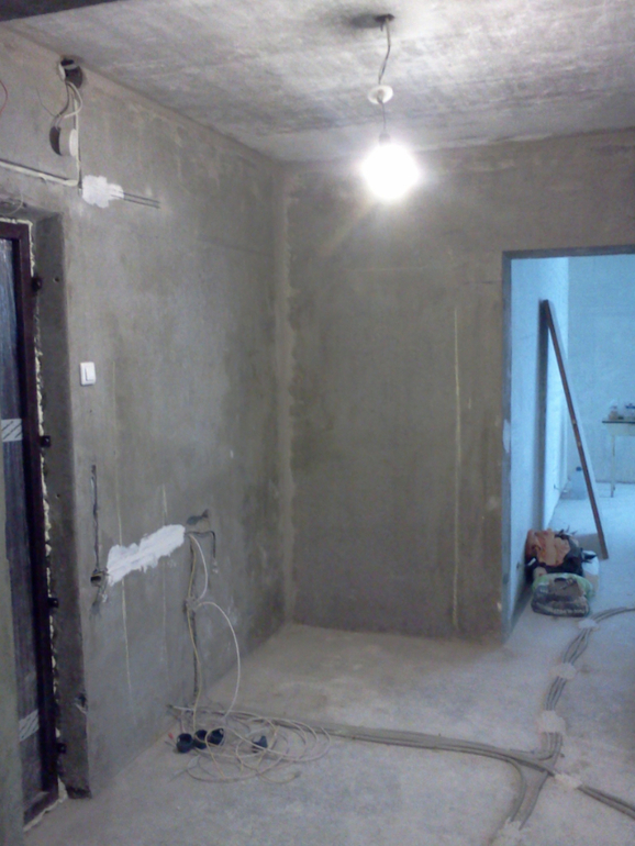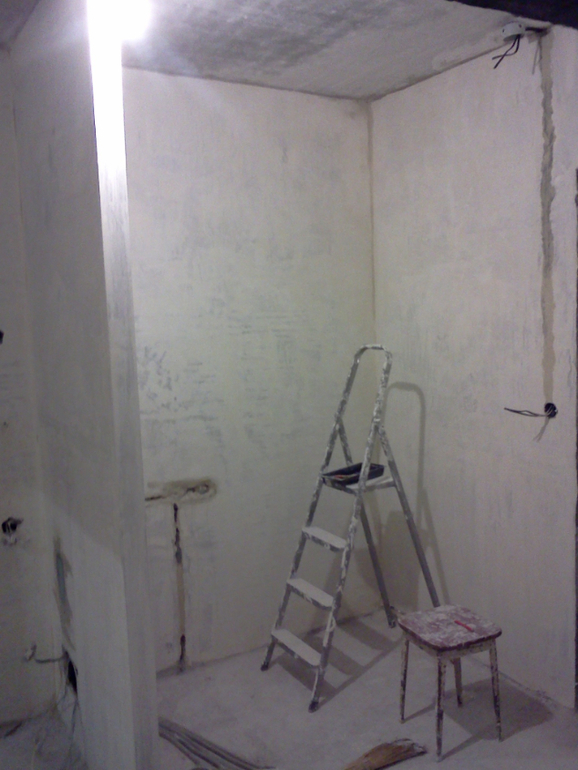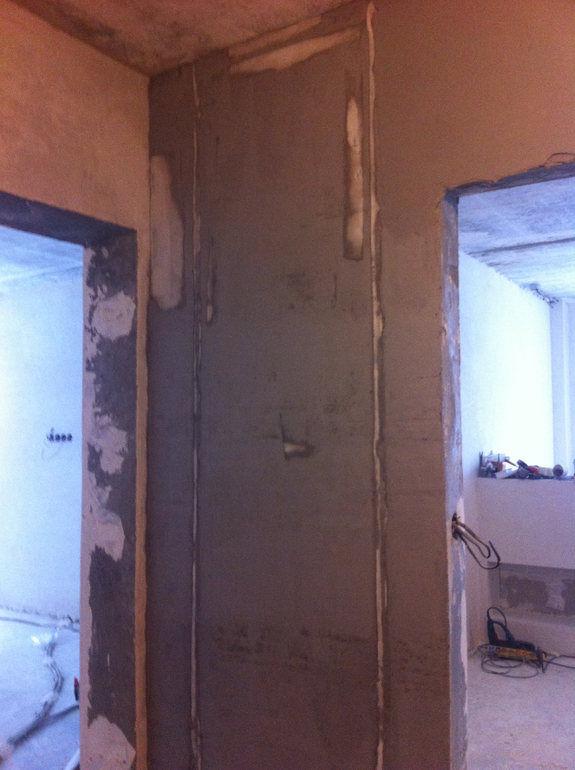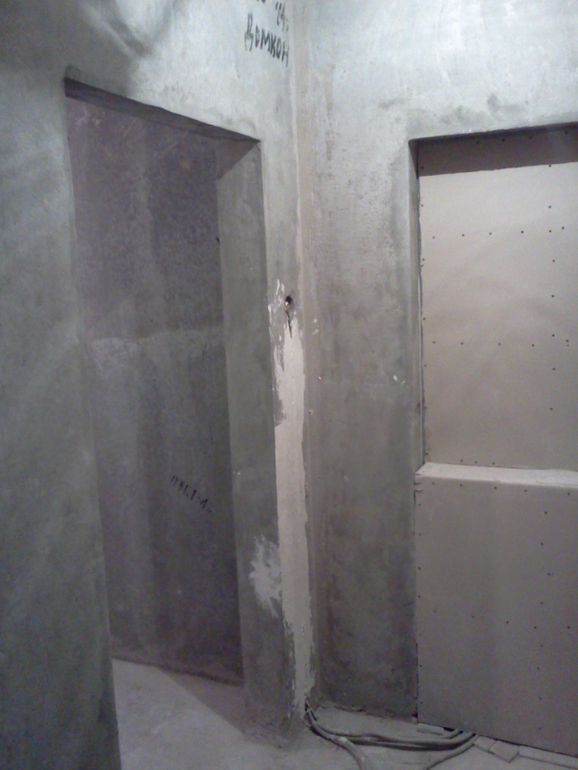После того как отштукатурили все комнаты и кухню, приступили к выравниванию стен в коридоре. У нас их получается как бы два, один при входе в квартиру, второй возле санузла.