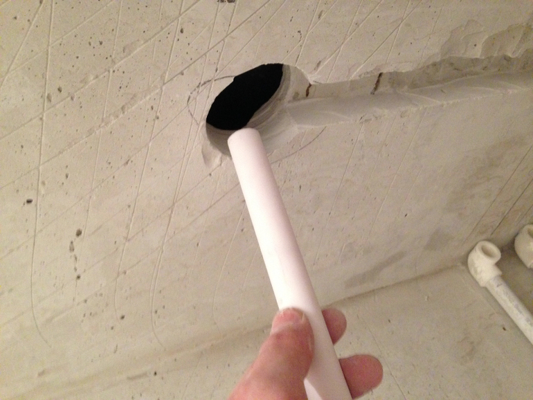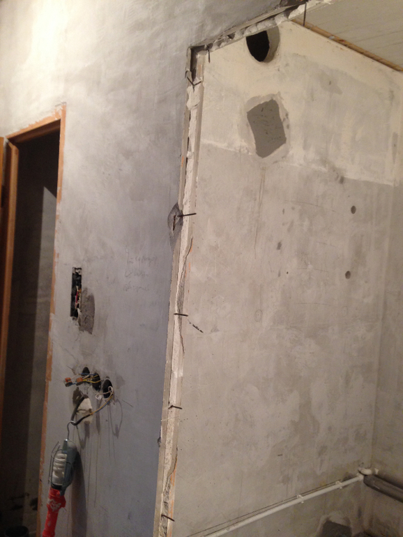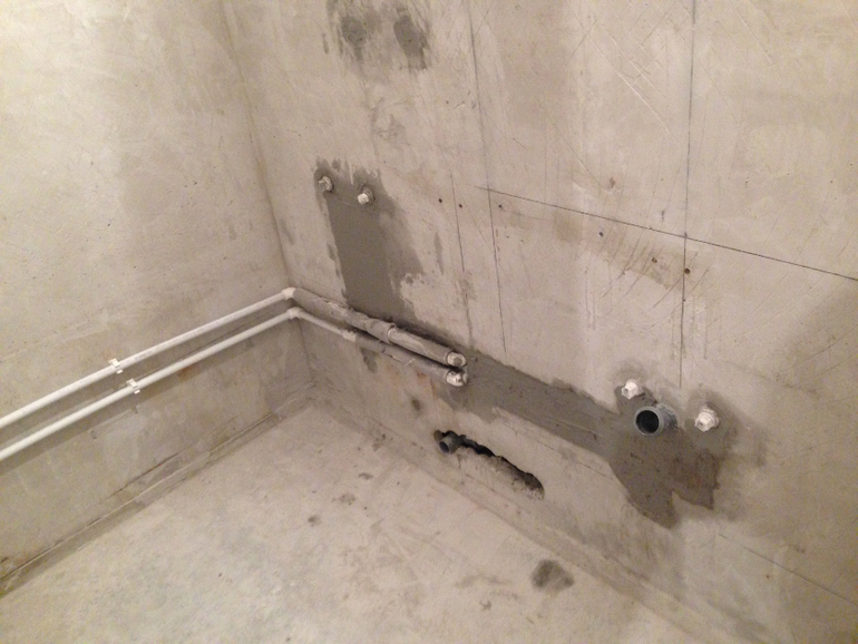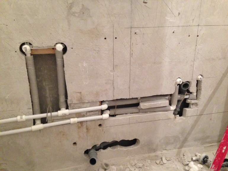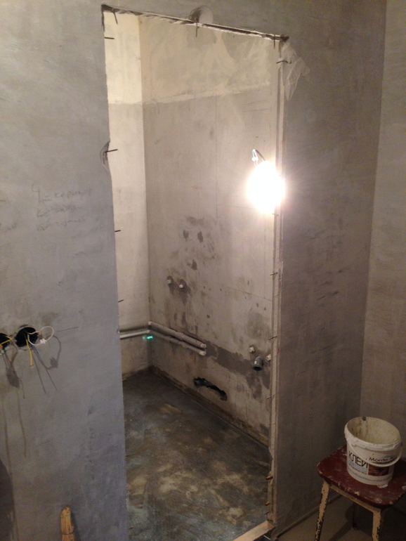 трубы решили спрятать в стене, пришлось тут ломать. Ох, там до бетонной стены оказалось почти 11 см. Вот ут мы подумали, зря не ломали, сколько полезной площади, даже если бы вновь возвели стены.