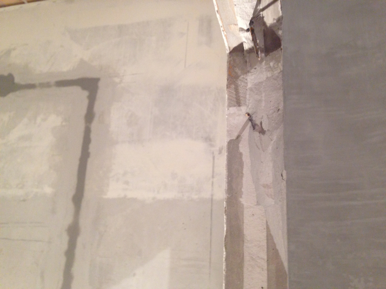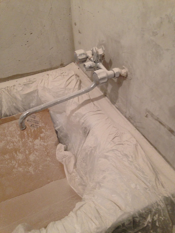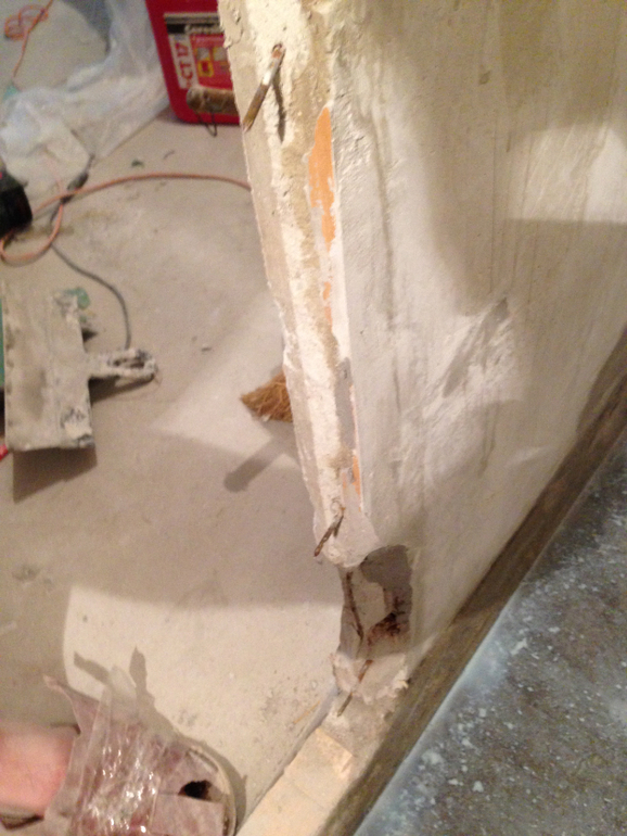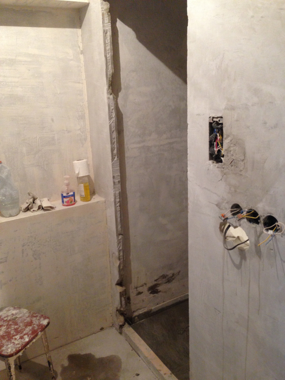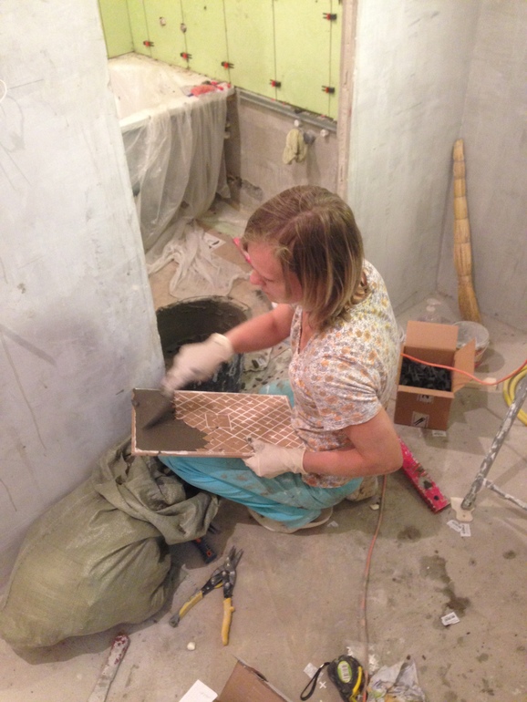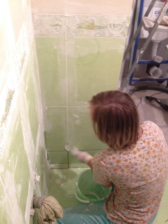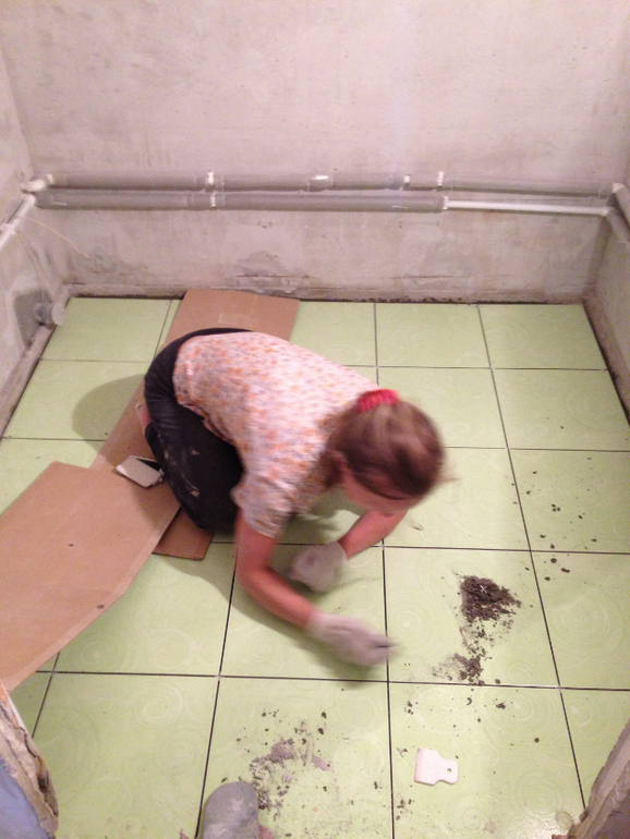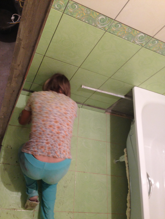 А потом мы поняли, что стены то мы не подготовили, а там на пол стены побелка. На побелку, как известно плитка не ляжет и принялись шкурить стену)