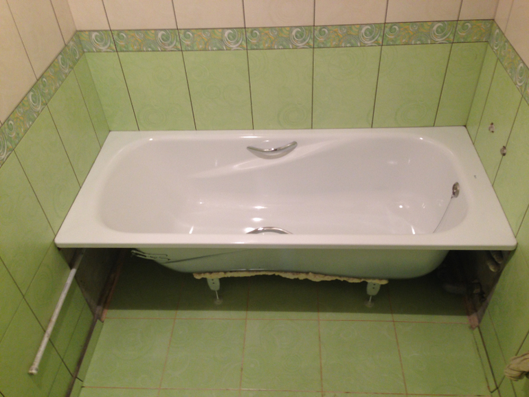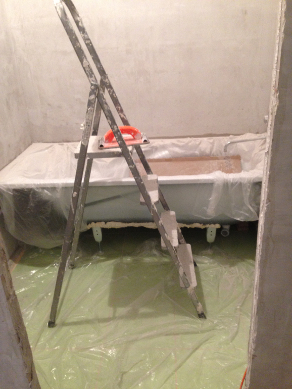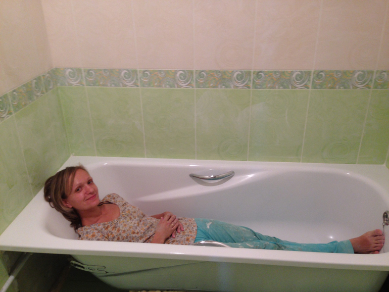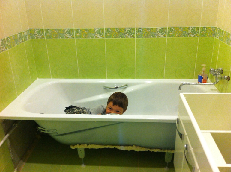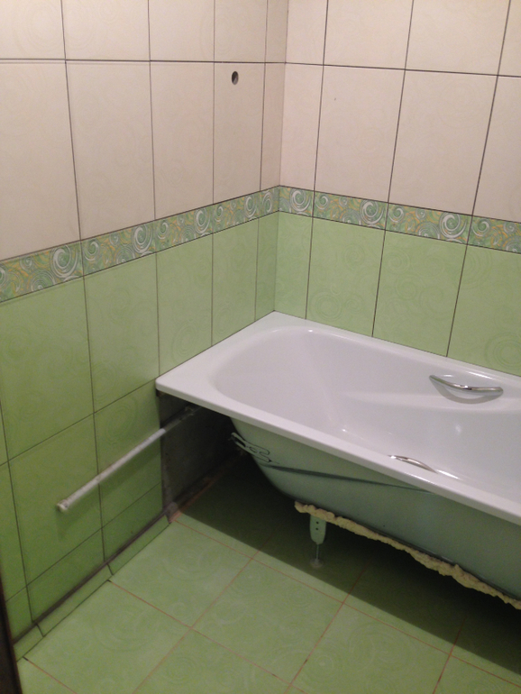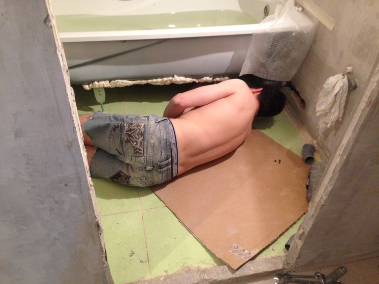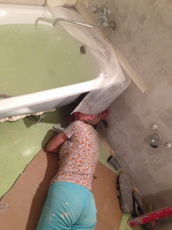 Установка ванны. Слава богу что купили не чугунную))) Эта оказалась намного тяжелее, чем от застройщика.