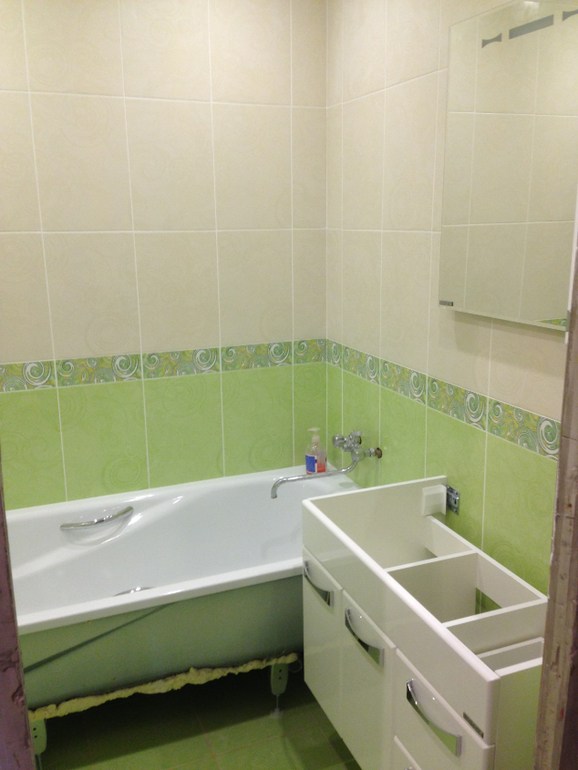 После этого пришла очередь ванны и плитки. Ванну хотели оставить от застройщика. Но поскольку когда мы штукатурили стены, я ведра мыла в ванной, и грубо говоря всю ее уделала. И не смогла потом отмыть. И мы решили все таки потратиться и купить ванну.