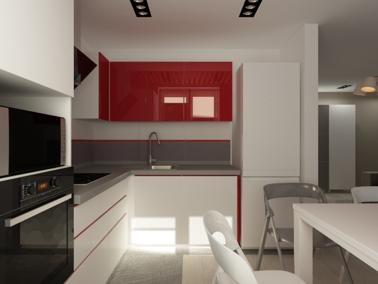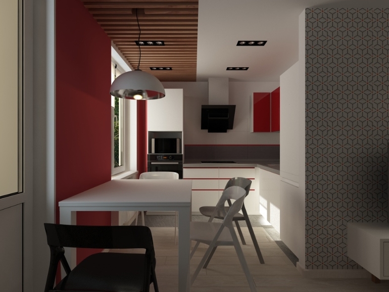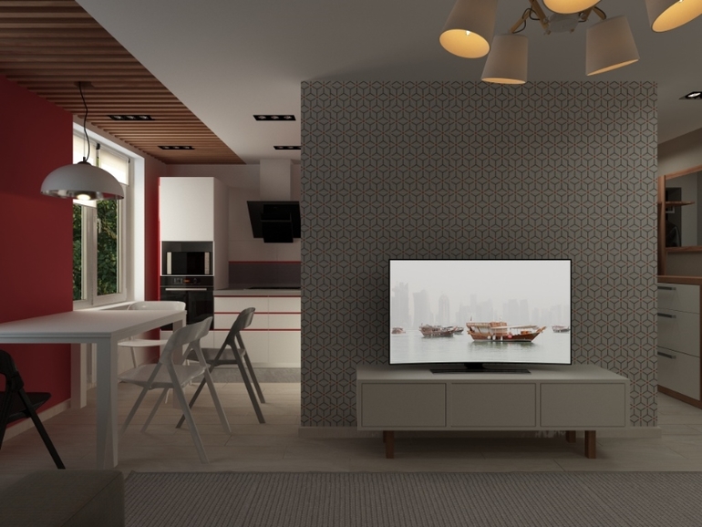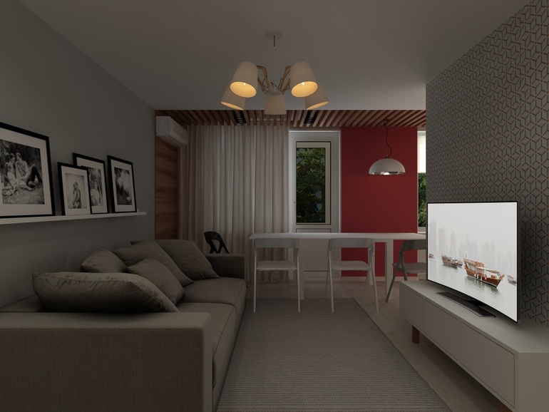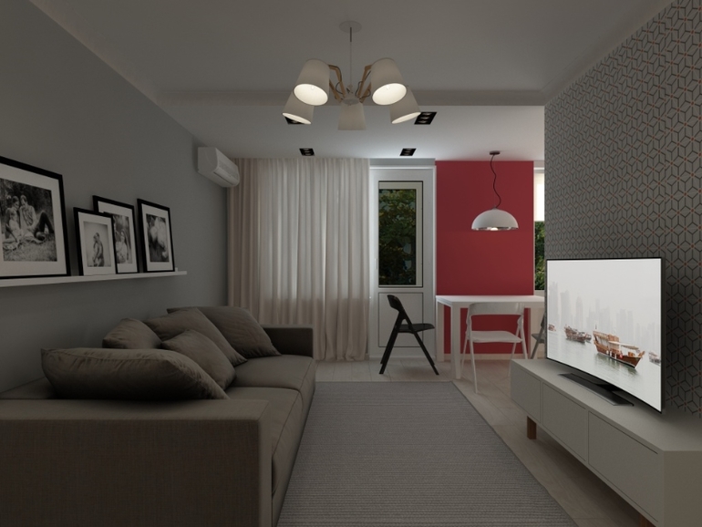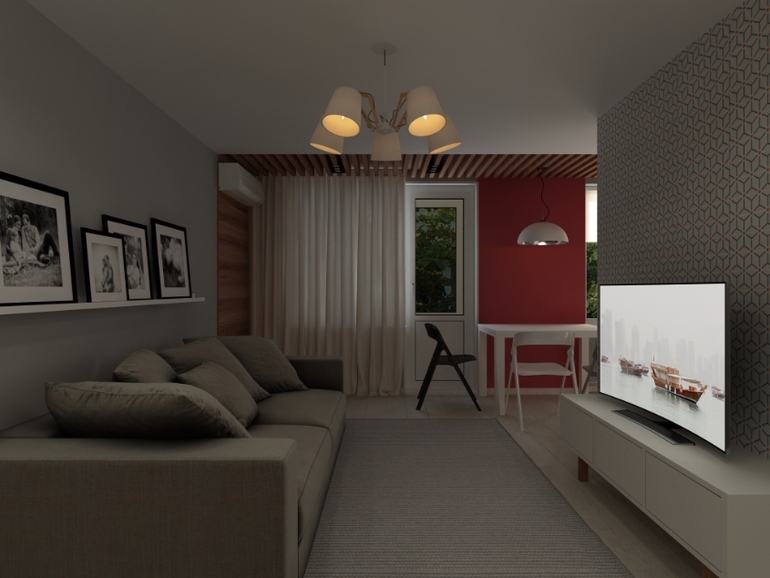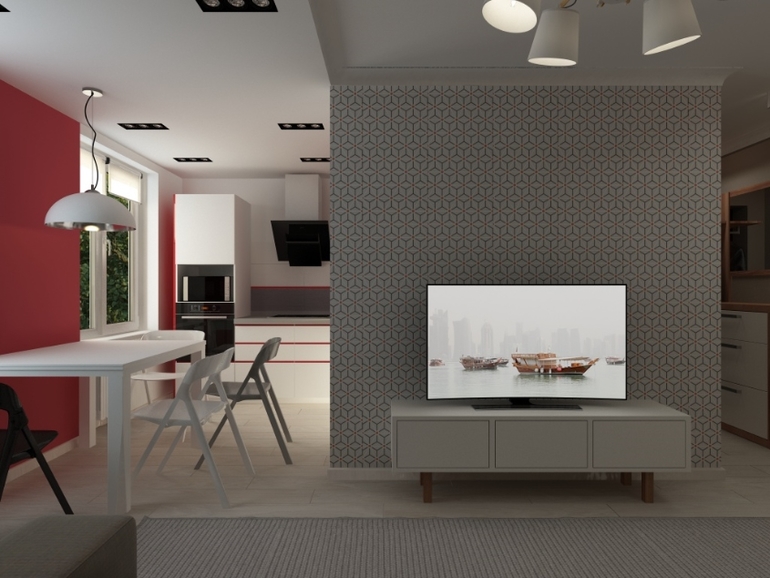 Интерьерное решение гостинойПредставляю вам сегодня проект объединения коридора,кухни и гостиной. Кухонный гарнитур был заказан заранее. Заказчику виделась квартира в серо-бело-красном цвете. Но я добавила тепло дерева) С удовольствием прорабатывала каждую деталь. Стены покрашены везде, кроме обоев на стене с телевизором.