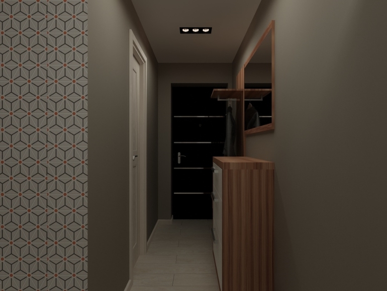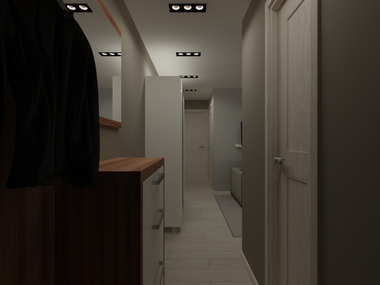 Мне не понравилось расположение встроенных светильников. По коридору лучше вдоль. Поперек - будут некрасивые пятна на стене. Визуализации не отражают их реального свечения. Идея с деревянным потолком оч понравилась. Он получается отходит немного от потолка? Как навесной или грильятто получается?