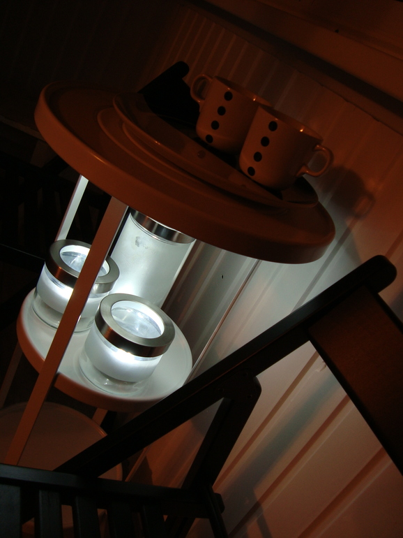 Аксессуары для вечерних посиделок, чашки, подносик, ниже на полке баночки, приспособленные под ночное освещение (положили в них светодиодные светильники на батарейках - дают теплый, романтичный, матовый свет).![]()