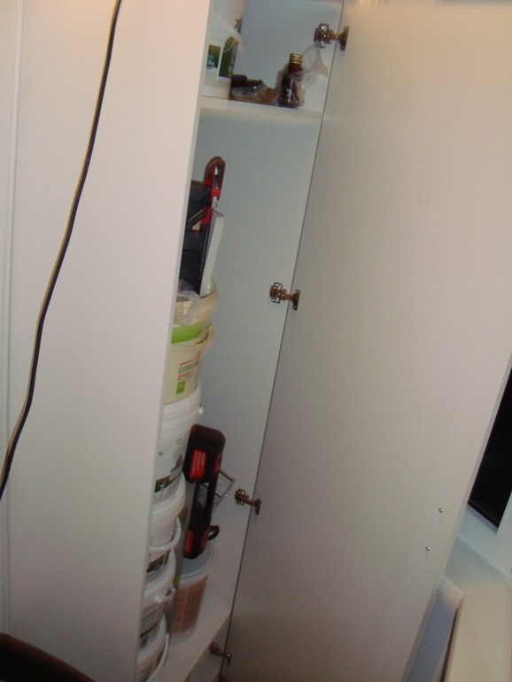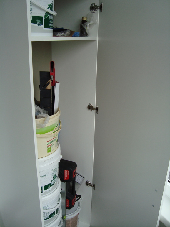 Как всегда был продуман функционал. Как ни крути, а в доме всегда найдутся вещи, которые в шкаф или гардеробную расположить жалко. Купили шкаф, узкий и компактный, но на удивление вместительный. Его наполнение в плане емкостей еще не освоено, поэтому храним в закрытых 10 л ведерках. Туда ушли и не приспособленные мною до сих пор палки для швабр, мытья окон, всякие гвоздики, отверточки и т.д. Упихали шкапчик в один из углов, пространство съедает по минимуму. Переживаю только как зиму переживет, но муж успокоил, что все будет нормально.(это дневное фото).