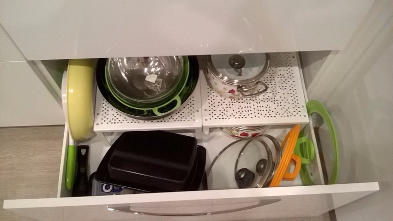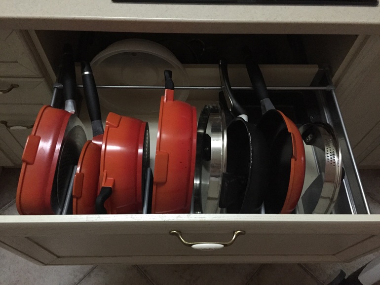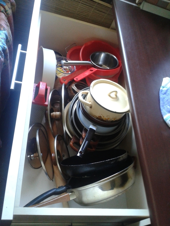 Вопросы и ответыТоварищи, нужны советы по размещению кастрюль и прочего в выдвижных ящиках. Имеется два ящика. Они огромные. При желании даже я сама туда могу уместиться. Но вот порядка в них навести не могу. Каждый раз вытаскивая кастрюлю или сковороду нужно перевернуть все вокруг. Достало. Вот так это сейчас выглядит.