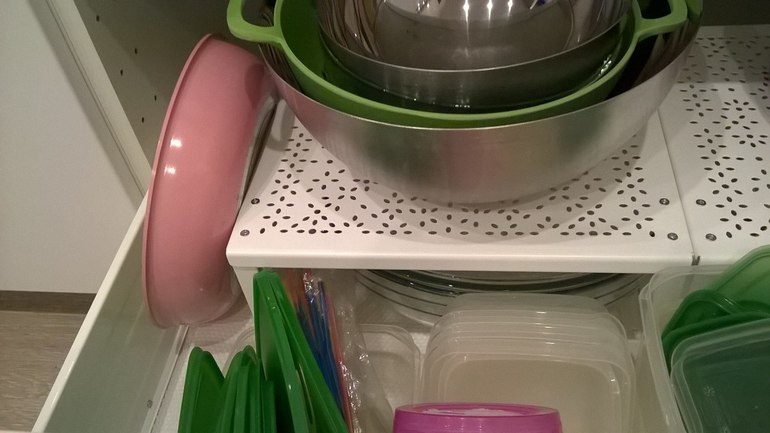 На самом деле кастрюль у меня штук 5 не больше-все разного объема (одна только дублирует). Рейлинги я принципиально не хочу, так как кухня маленькая и будет захламленность и так стараюсь все с вида убрать. Сковородок три штуки. Два разных дуршлака, мини ковшик для каши. Пара глубоких мисок. Короче, и выкинуть то особо не чего. Вот заменить на одинаковые-да, но пока это вопрос времени. Наверное придется купить разграничители, что бы запихать в них крышки. А с посудой для еды я давно разобралась и оставила только сервиз для. И штук 5-6 кружек. Чашки кофейные и чайные на подставках спрятаны в шкафчик.
