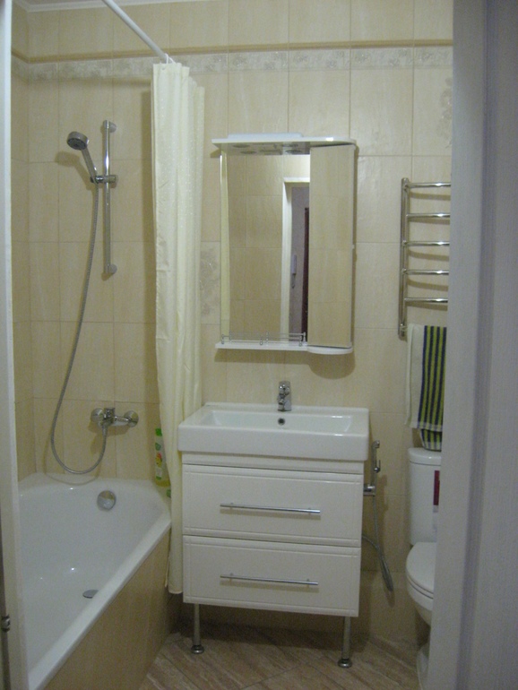 Имеется стандартная ванная комната в панельке 150 см/170 см, высота потолков 245 см.