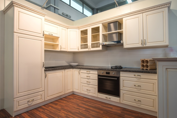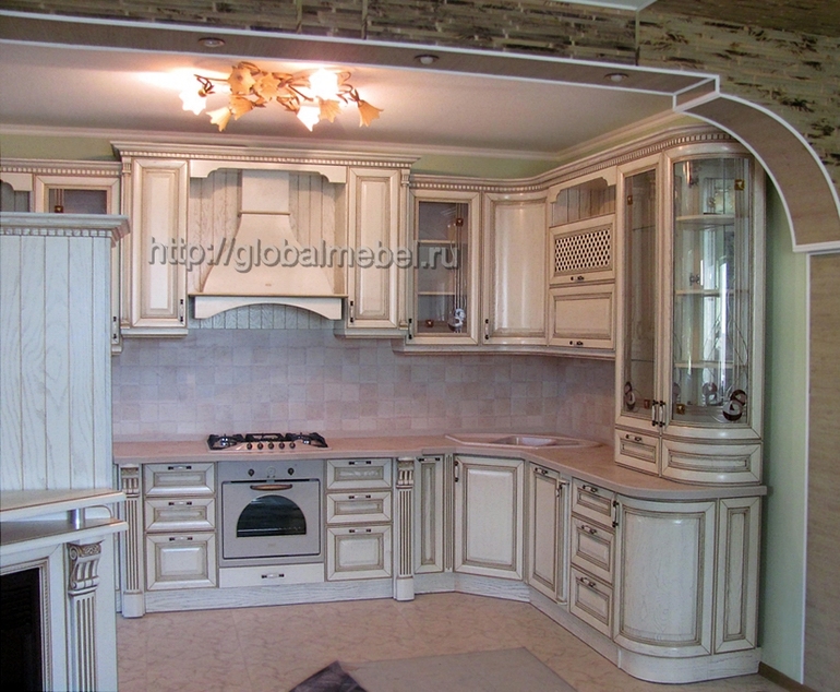 Хорошо подходят к такой плитке варианты фасадов в белом цвете с коричневой патиной.