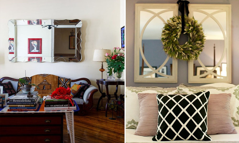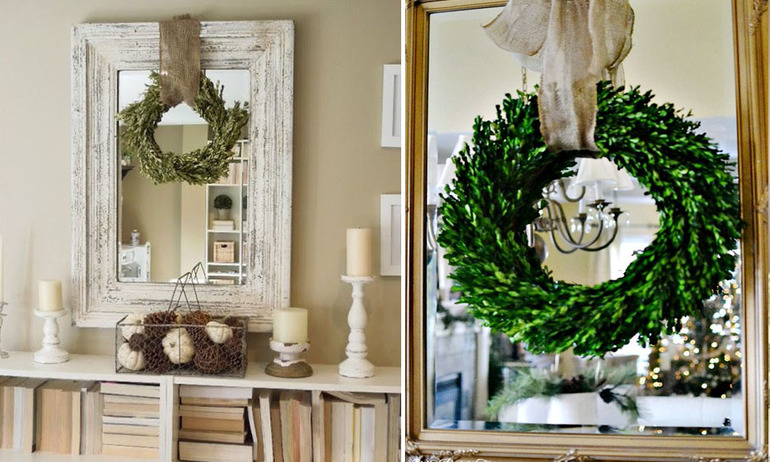 В некоторых странах зеркало, которое служит для декоративных целей, принято украшать венком, подвешенным на ленте. Это создает эффект переднего плана. Разумно, поскольку большое полотно зеркала от этого только выигрывает. Также на лентах можно подвешивать небольшие рамки.
