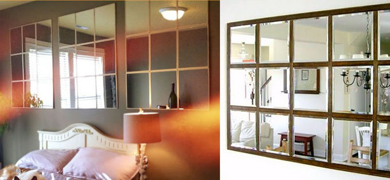 Большое зеркало стоит дорого. Антикризисный способ - квадратные зеркала, приклеенные на деревянное основание. В ИКЕА есть набор из 9 зеркал за 350р. Эффектная композиция за диваном, которая добавит комнате освещенности.