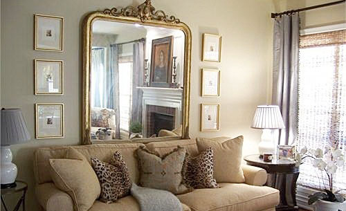 Зеркало за диваном может быть вертикальным. В таком случае для завершения композиции можно добавить картины по бокам.