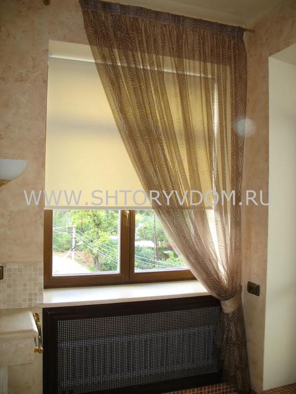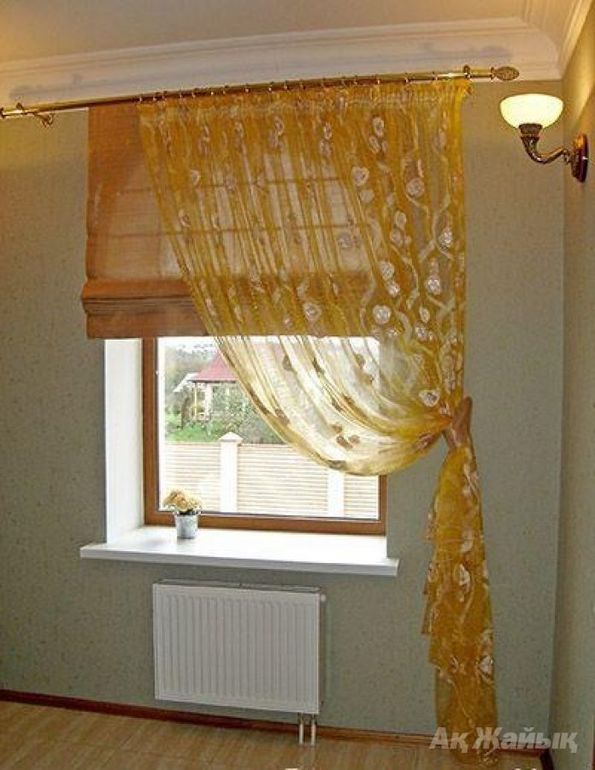 Красота!!! Я не дизайнер и вы можете серьезно не относится к моим рекомендациям)))) Сама гардина должна быть "легкая" -метал под цвет ручек на гарнитуре , а тюль однотонную беж. У вас обои в цветочек мелкий и если еще тюль в цветочек - не красиво! Как вариант - полоска еще подойдет. Видно, что первый этаж - можно рулонные или римские шторы на сами окна или сейчас появились более современные (крепятся прям к самой раме) Примерно это выглядит так: